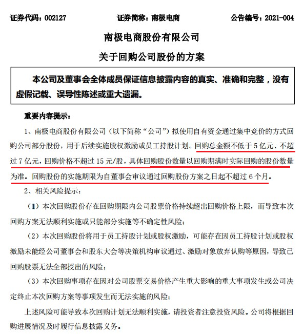 1月6日,南极电商发布公告,拟使用自有资金通过集中竞价的方式回购公司部分股份,回购总金额不低于5亿元、不超过7亿元,回购价格不超过15元/股。